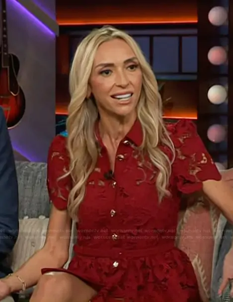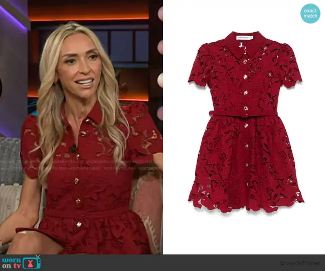 on The Kelly Clarkson Show on NBC was spotted wearing this red lace mini dress on The Kelly Clarkson Show on Oct 13 2025's episode. 's Dress is the Floral-lace mini dress by Self Portrait.