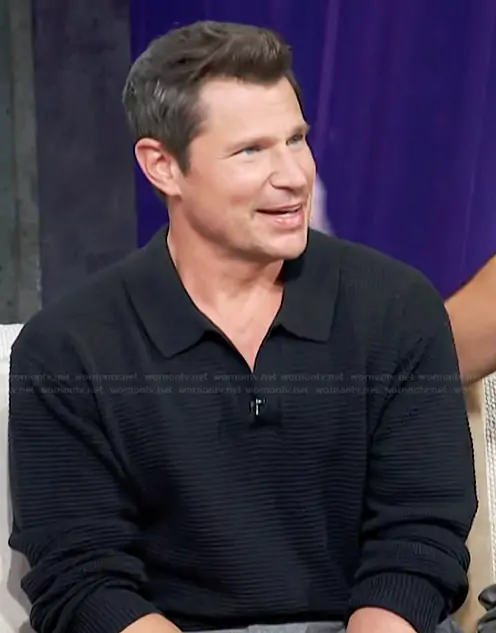 on Access Hollywood on NBC was spotted wearing this black v-neck sweater on Access Hollywood on Oct 13 2025's episode. 's Sweater is the Silk Blend Polo Sweater by Frame.