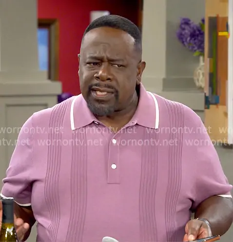 Calvin (played by Cedric The Entertainer) on The Neighborhood on CBS was spotted wearing this purple polo shirt on The Neighborhood on episode 'Welcome to the New Normals' (8x01) in Oct 2025. Calvin's Shirt is the Silk-Cotton Tipped Sweater Polo in Smoked Mauve by Todd Snyder.