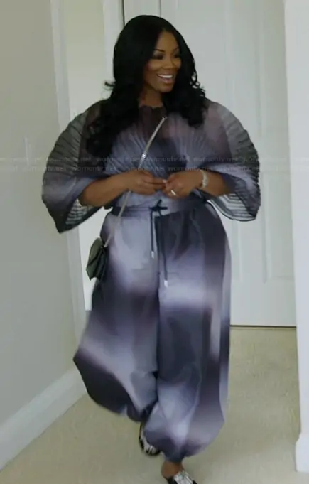 Michelle on The Real Housewives of Potomac on Bravo was spotted wearing this pleated top and pants on The Real Housewives of Potomac on episode 'Second Bloom' (10x01) in Oct 2025. 's Top is the Forget About it Ombre Blouse by Akira . 's Pants is the Forget About it Ombre Jogger by Akira.