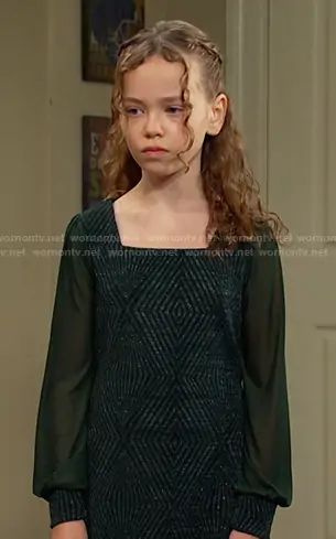 Rachel Black (played by Alice Halsey) on Days of our Lives on Peacock was spotted wearing this green embellished sheer sleeve dress on Days of our Lives on Oct 14 2025's episode. 's Dress is the Big Girls Knee Length Square Neck Long Sleeve Dress by Speechless.