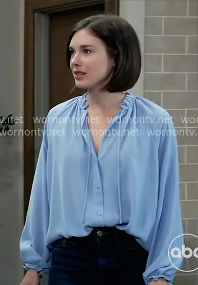 Willow Tait (played by Katelyn MacMullen) on General Hospital on ABC was spotted wearing this blue tie neck blouse on General Hospital on Oct 13 2025's episode. Willow's Top is the Olivette Blouse by Wilfred at Aritzia .