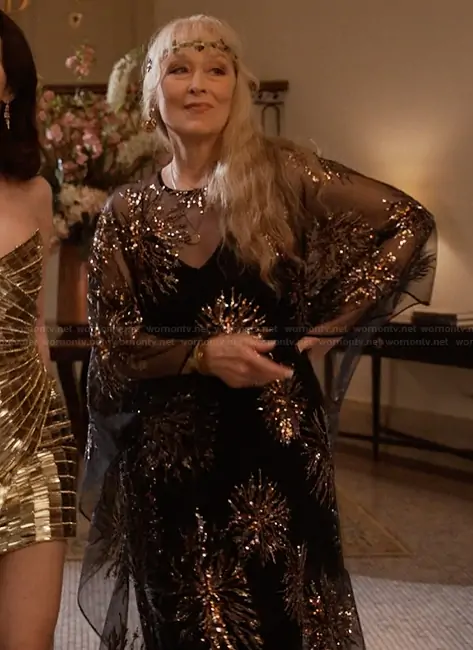 Loretta Durkin (played by Meryl Streep) on Only Murders in the Building on Hulu was spotted wearing this black sheer embellished dress on Only Murders in the Building on episode 'Cuckoo Chicks' (5x08) in Oct 2025. Loretta's Dress is the Gran Soleil maxi dress by Taller Marmo.