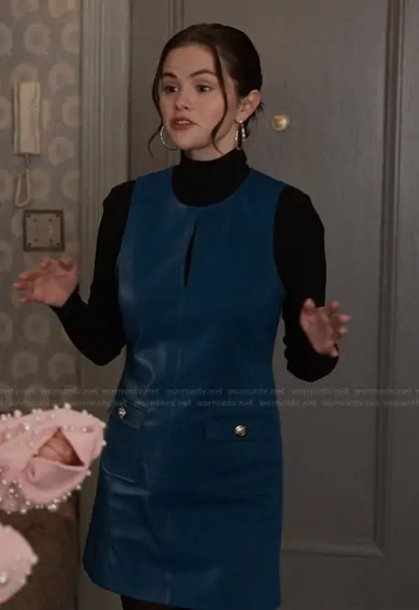 Mabel Mora (played by Selena Gomez) on Only Murders in the Building on Hulu was spotted wearing this blue leather mini dress on Only Murders in the Building on episode 'Cuckoo Chicks' (5x08) in Oct 2025. Mabel's Dress is the Mia Embossed Faux Leather Sleeveless Minidress by Cinq a Sept.
