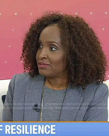 on Today on NBC was spotted wearing this grey embellished pinstripe suit on Today on Oct 14 2025's episode. 's Jacket is the Embellished Pinstripe Relaxed One-Button Blazer by White House Black Market . 's Pants is the Embellished Elle Slim Ankle Pant by White House Black Market.