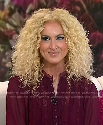 on Today on NBC was spotted wearing this burgundy lace trim blouse and mini skirt on Today on Oct 14 2025's episode. 's Top is the Alvynne Top in Oxblood by LoveShackFancy . 's Skirt is the Fleetta Skirt in Oxblood by LoveShackFancy.