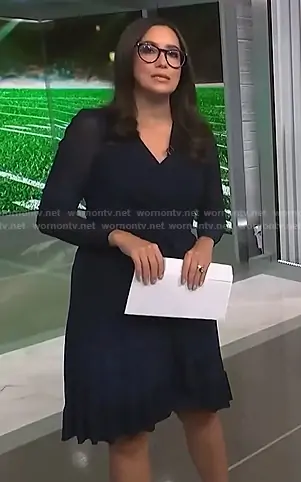 Savannah Sellers on NBC News Daily on NBC was spotted wearing this navy print wrap dress on NBC News Daily on Oct 14 2025's episode. Savannah's Dress is the Printed Mesh-sleeve Wrap Dress by Scoop.
