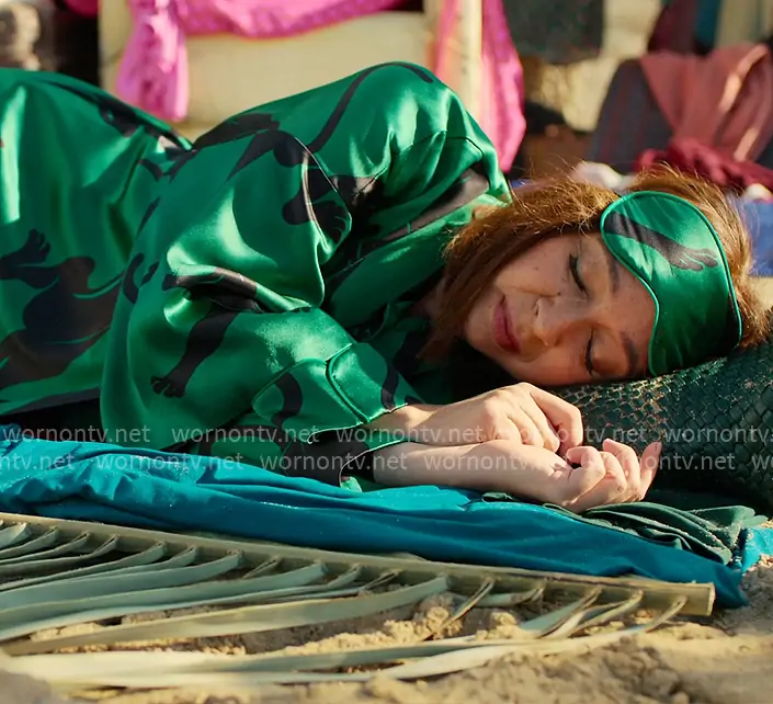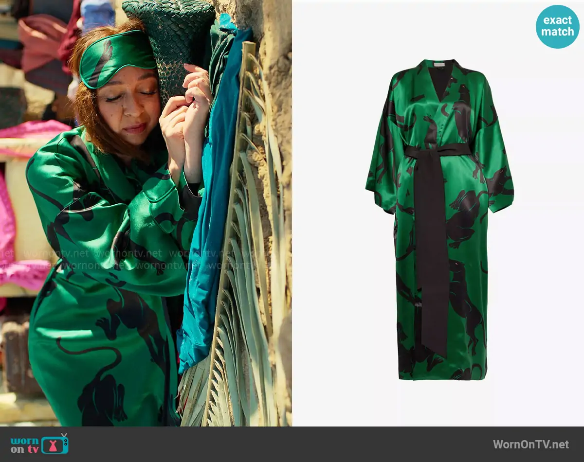 Molly Novak (played by Maya Rudolph) on Loot on Apple was spotted wearing this green panther print robe on Loot on episode 'Up and Away' (3x01) in Oct 2025. Molly's Robe is the Queenie panther-print silk robe in Poiret by Olivia von Halle.