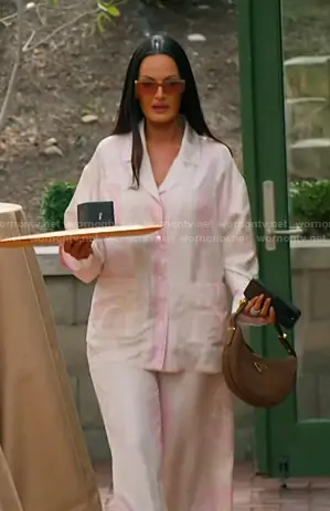 Lisa Barlow on The Real Housewives of Salt Lake City on Bravo was spotted wearing this pink print pajama shirt and pants on The Real Housewives of Salt Lake City on episode 'The Salt Lake City Soup Man' (6x05) in Oct 2025. Lisa's Top is the La Coupe Des Dieux Silk Shirt by Versace . Lisa's Pants is the La Coupe Des Dieux Silk Pants by Versace . Lisa's Sunglasses is the Fendi Way Rectangle Sunglasses in Sltbrn by Fendi . Lisa's Bag is the Arqué Small Suede Shoulder Bag in Brown by Prada.