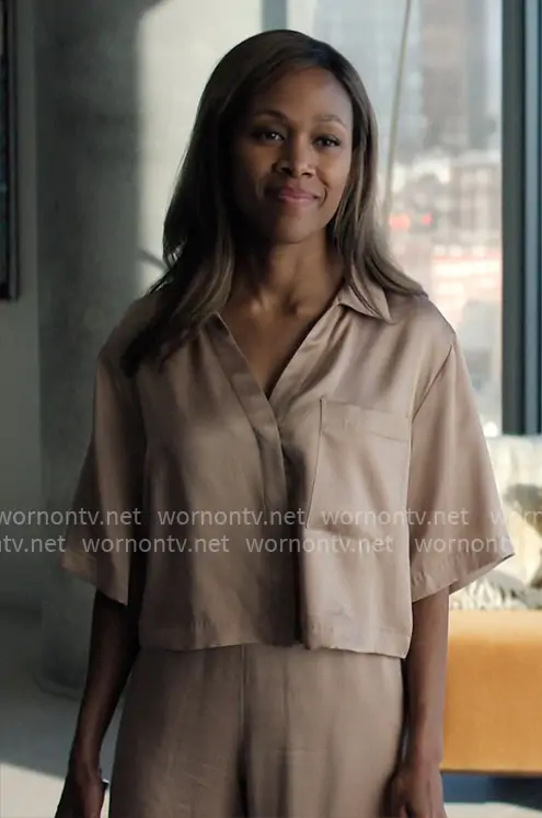 Christina Hunter (played by Nicole Beharie) on The Morning Show on Apple TV was spotted wearing this cropped silk pajamas on The Morning Show on episode 'Amari' (4x05) in Oct 2025. Christina's Pajamas is the Washable Silk High-Rise Pants 2-Piece Pajama Set in Delicate Pink by Lunya.