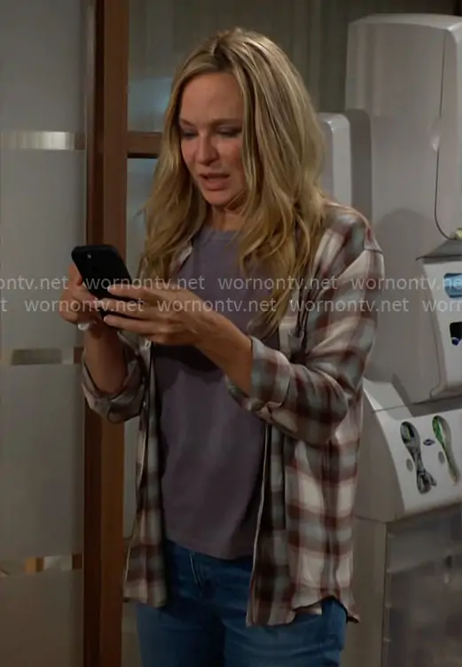 Sharon Newman (played by Sharon Case) on The Young and the Restless on CBS was spotted wearing this plaid shirt on The Young and the Restless on Oct 15 2025's episode. Sharon's Shirt is the Hunter Shirt in Birch Olive Teal by Rails .