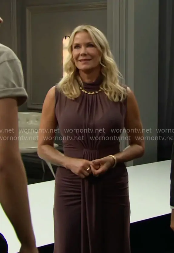 Brooke Logan (played by Katherine Kelly Lang) on The Bold and the Beautiful on CBS was spotted wearing this taupe draped dress on The Bold and the Beautiful on Oct 15 2025's episode. Brooke's Dress is the Daniella Dress in Taupe by Reiss .