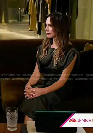on Today on NBC was spotted wearing this dark green satin top and skirt on Today on Oct 15 2025's episode. 's Top is the Satin Draped-Sleeve Top in Dark Olive by Victoria Beckham . 's Skirt is the Ruched Satin Midi-Skirt in Dark Olive by Victoria Beckham.