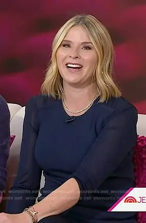 Jenna Bush Hager on Today on NBC was spotted wearing this navy ribbed sheer knit dress on Today on Oct 15 2025's episode. Jenna's Dress is the Semi-Sheer Knit Midi Dress by Derek Lam 10 Crosby.