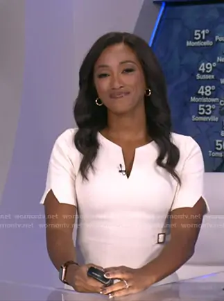 Brittany Bell on Good Morning America on ABC was spotted wearing this white pelated short sleeve dress on Good Morning America on Oct 15 2025's episode. Brittany's Dress is the Tailored Military Pleat Short Sleeve Mini Dress in Ivory by Karen Millen.