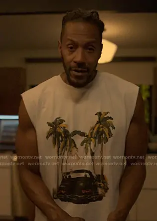 Lewis Stewart (played by McKinley Freeman) on Reasonable Doubt on Hulu was spotted wearing this white print muscle tee on Reasonable Doubt on episode 'No Church in the Wild' (3x06) in Oct 2025. Lewis's Shirt is the Terry Muscle T-Shirt by RTA.