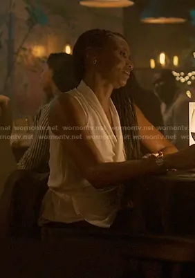 Jax Stewart (played by Emayatzy Corinealdi) on Reasonable Doubt on Hulu was spotted wearing this white sleeveless wrap top on Reasonable Doubt on episode 'No Church in the Wild' (3x06) in Oct 2025.