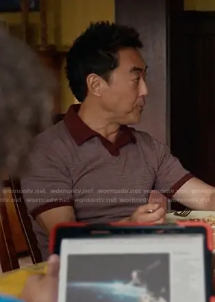 Howard Han (played by Kenneth Choi) on 9-1-1 on ABC was spotted wearing this burgundy striped polo on 9-1-1 on episode 'Spiraling' (9x02) in Oct 2025. 's Shirt is the Liam Polo in Burgundy & Natural by Marine Layer.