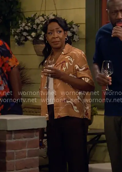 Tina Butler (played by Tichina Arnold) on The Neighborhood on CBS was spotted wearing this orange floral shirt on The Neighborhood on episode 'Welcome to the Downsizing' (8x02) in Oct 2025. Tina's Top is the Sandy Floral Print Shirt by Reiss.