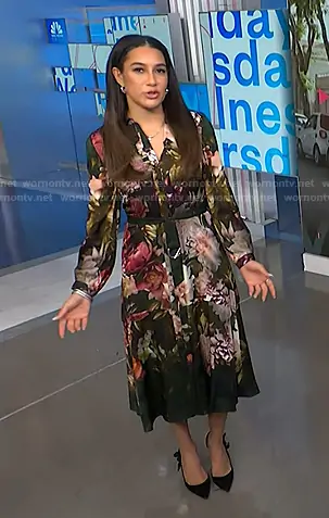 Morgan Radford on NBC News Daily on NBC was spotted wearing this floral belted shirtdress on NBC News Daily on Oct 16 2025's episode. Morgan's Dress is the Mila Floral Silk-Blend Midi-Shirtdress by Elie Tahari.