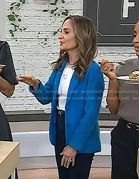 Joy Bauer on Today on NBC was spotted wearing this blue cable knit blazer on Today on Oct 17 2025's episode. Joy's Jacket is the Cable Knit Wool Sweater Blazer by Liz Claiborne.