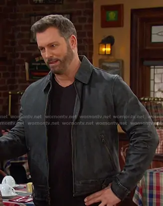 Brady Black (played by Eric Martsolf) on Days of our Lives on Peacock was spotted wearing this black leather zip jacket on Days of our Lives on episode 'Doll Day Afternoon' (3x02) in Oct 2025. 's Jacket is the Sorcha Leather Jacket by John Varvatos.