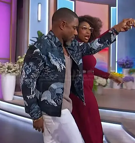 on The Jennifer Hudson Show on FOX was spotted wearing this printed jacket on The Jennifer Hudson Show on Oct 02 2025's episode. 's Jacket is the Crane Tapestry jacket by Amiri.