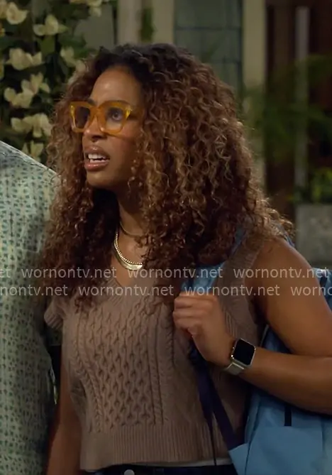 Courtney (played by Skye Townsend) on The Neighborhood on CBS was spotted wearing this brown cable knit sweater vest on The Neighborhood on episode 'Welcome to the Downsizing' (8x02) in Oct 2025. Courtney's Vest is the Emporia Merino Wool Sweater Vest by Babaton at Aritzia.