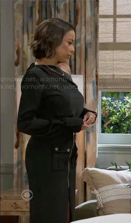 Nicole Dupree Richardson (played by Daphnee Duplaix) on Beyond the Gates on CBS was spotted wearing this black asymmetric blouse and pencil skirt on Beyond the Gates on Oct 20 2025's episode. Nicole's Top is the Alice Top by Simkhai . Nicole's Skirt is the Belted Utility Skirt by White House Black Market.