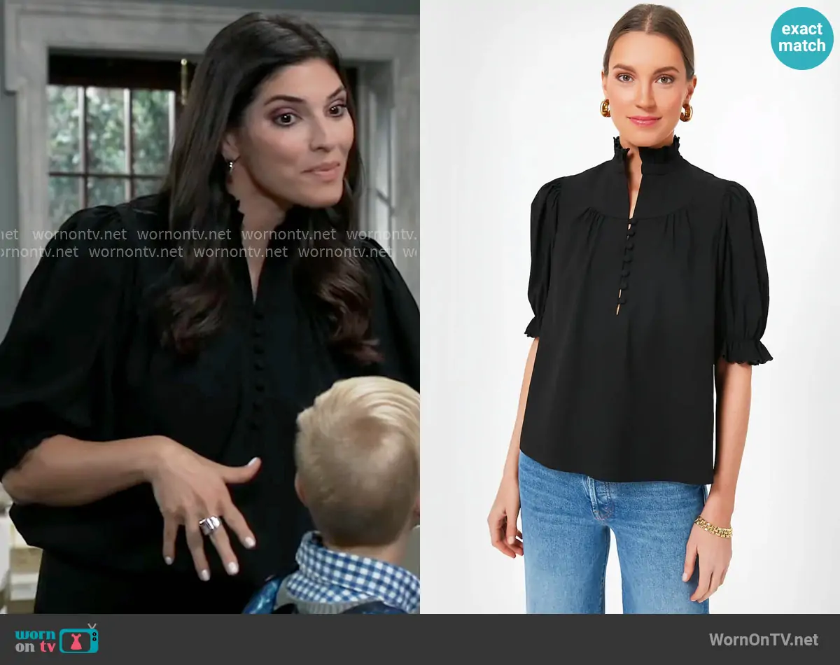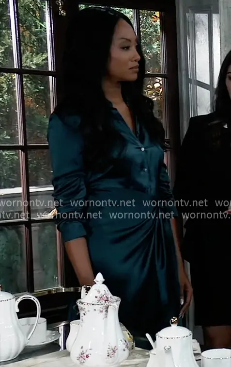 Jordan Ashford (played by Tanisha Mariko Harper) on General Hospital on ABC was spotted wearing this teal green satin shirtdress on General Hospital on Oct 20 2025's episode. Jordan's Dress is the Jacey Mini Dress in Green Onyx by Cinq a Sept .