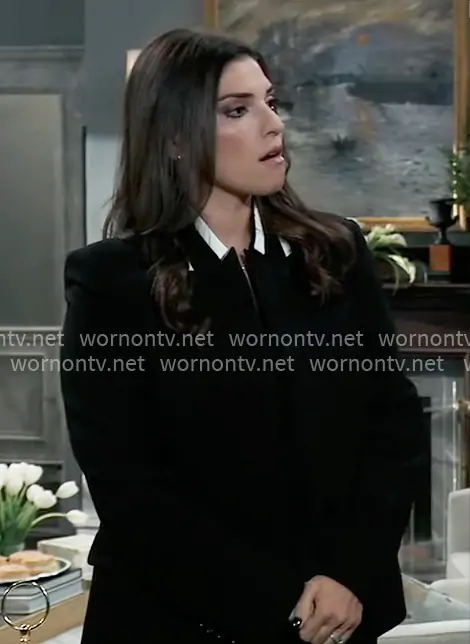 Brook Lynn Quartermaine (played by Amanda Setton) on General Hospital on ABC was spotted wearing this black blazer with striped collar on General Hospital on Oct 20 2025's episode. Brook Lynn's Jacket is the Contrast Collar Suit Blazer by Karl Lagerfeld.