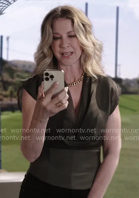 Eve Drake (played by Jenna Elfman) on Shifting Gears on ABC was spotted wearing this olive v-neck top on Shifting Gears on episode 'Date' (2x02) in Oct 2025. Eve's Top is the Pinnacle Top in Truffle by Staud.