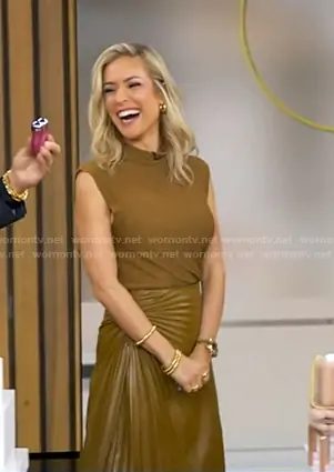 on Good Morning America on ABC was spotted wearing this khaki sweater and pleated leather skirt on Good Morning America on Oct 21 2025's episode. 's Top is the Jada Top in Saddle by A.L.C. . 's Skirt is the Tracy Skirt by A.L.C. . 's Earrings is the Rare Hoop Earrings by Uncommon James.