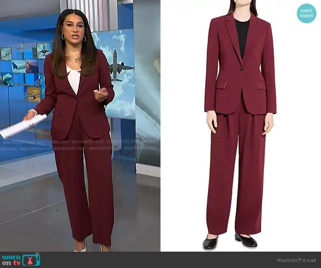Morgan Radford on NBC News Daily on NBC was spotted wearing this burgundy blazer and drawstring pants on NBC News Daily on Nov 03 2025's episode. Morgan's Jacket is the Staple Classic Crepe Single-Button Blazer in Grenache by Theory . Morgan's Pants is the Pleated Crêpe Casual Pants in Grenache by Theory.