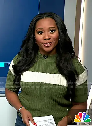 Kay Angrum on NBC News Daily on NBC was spotted wearing this green stripe short sleeve sweater on NBC News Daily on Oct 21 2025's episode. Kay's Sweater is the Striped Short Sleeve Mock-Neck Sweater in Green by Pilcro.