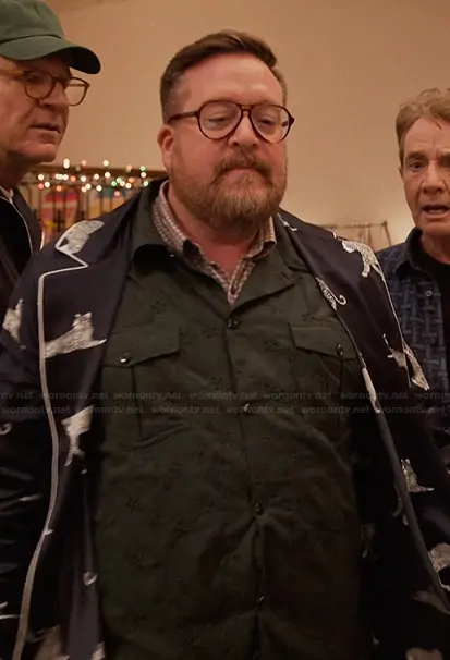 Howard Morris (played by Michael Cyril Creighton) on Only Murders in the Building on Hulu was spotted wearing this green embroidered shirt on Only Murders in the Building on episode 'Lestr' (5x09) in Oct 2025. 's Shirt is the Broderie Anglaise Cotton Overshirt Corridor . 's Robe is the Silk Long Robe in Panthère de Nuit by Petite Plume.