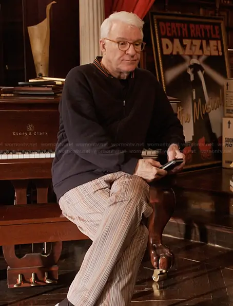 Charles-Haden Savage (played by Steve Martin) on Only Murders in the Building on Hulu was spotted wearing this stripe trim jacket on Only Murders in the Building on episode 'Lestr' (5x09) in Oct 2025. Charles's Jacket is the Striped-collar logo-patch jacket by Paul Smith . Charles's Pants is the Striped Cotton Pyjama Trousers by Paul Smith.