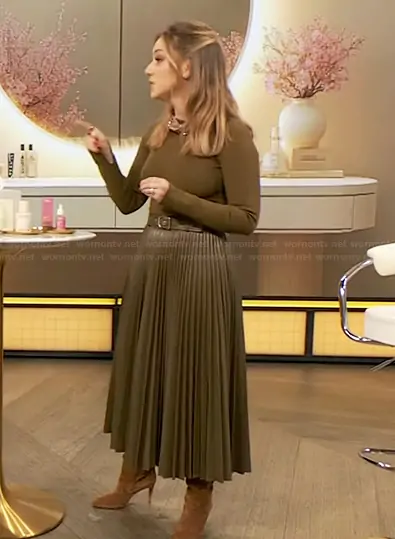 on The Drew Barrymore Show on CBS was spotted wearing this green pleated dress on The Drew Barrymore Show on Oct 22 2025's episode. 's Dress is the Abilene Mixed-Media Midi-Dress by Simkhai.