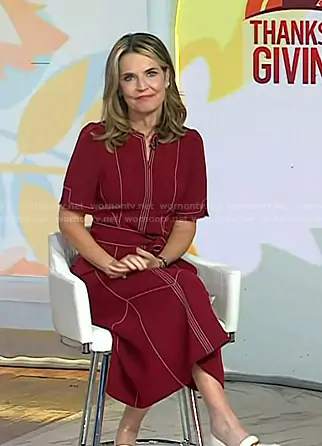 Savannah Guthrie on Today on NBC was spotted wearing this red contrast stitch dress on Today on Nov 24 2025's episode. Savannah's Dress is the Midi Dress + Belt by Me + Em.