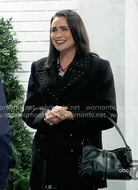 Lois Cerullo (played by Rena Sofer) on General Hospital on ABC was spotted wearing this black studded coat on General Hospital on Oct 22 2025's episode. Lois's Coat is the Wool Blend Studded Coat by Zara . Lois's Bag is the Astor Large Leather Pouchette by MICHAEL Michael Kors.