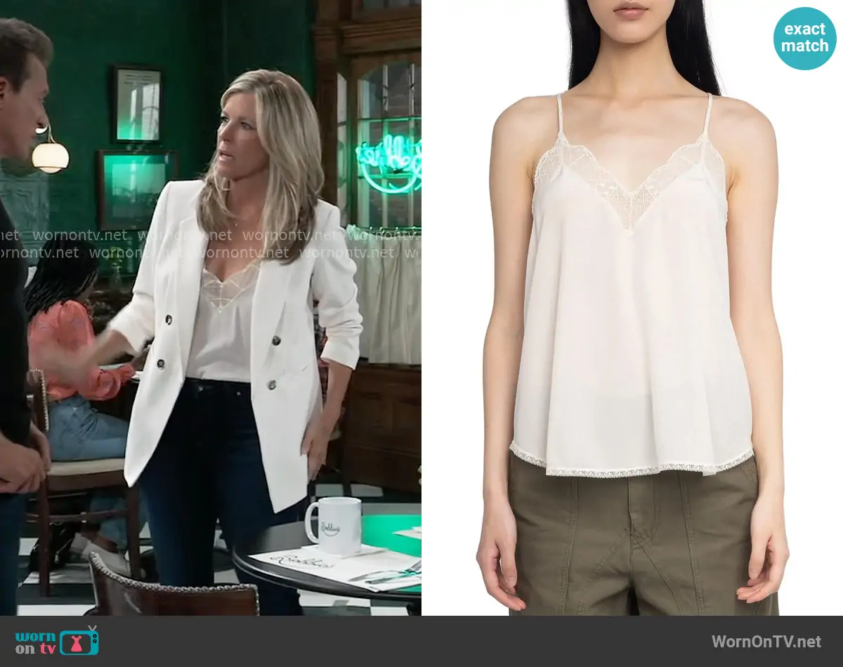 Tracy Quartermaine (played by Jane Elliot) on General Hospital on ABC was spotted wearing this red striped pajamas on General Hospital on Oct 22 2025's episode. Tracy's Pajamas is the Striped Satin Pajama Set by Jones New York.