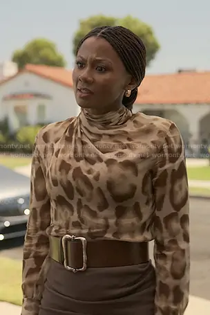 Jax Stewart (played by Emayatzy Corinealdi) on Reasonable Doubt on Hulu was spotted wearing this beige leopard blouse on Reasonable Doubt on episode 'Lost One' (3x07) in Oct 2025. Jax's Top is the Silk Blouse by Celine . Jax's Belt is the wblaire Leather Wide Belt by Ba&Sh.