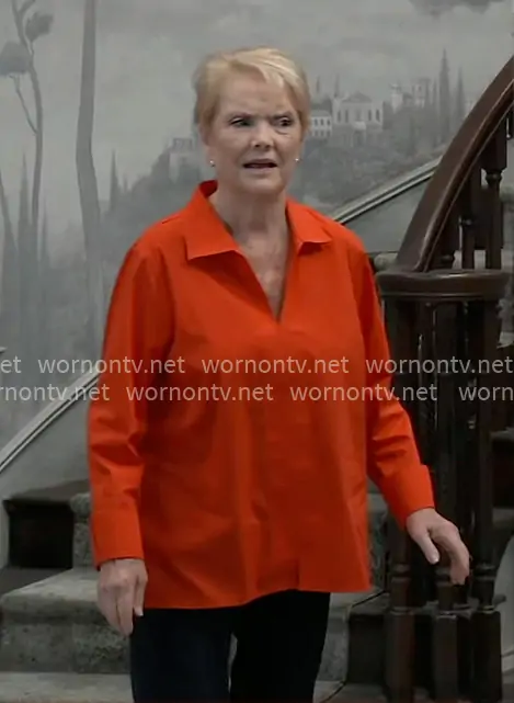 Veronica Bard (played by Erika Slavek) on General Hospital on ABC was spotted wearing this red collared top on General Hospital on Oct 23 2025's episode. 's Top is the Agnes Split Cuff Popover Blouse in Simply Red by Foxcroft .