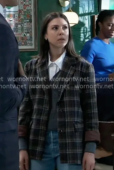 Kristina Corinthos-Davis (played by Kate Mansi) on General Hospital on ABC was spotted wearing this plaid jacket on General Hospital on Oct 23 2025's episode. Kristina's Jacket is the Old Money Oversized Blazer by Sadie & Sage.