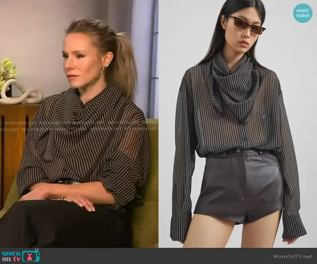 on Access Hollywood on NBC was spotted wearing this black striped scaf shirt on Access Hollywood on Oct 23 2025's episode. 's Top is the Peri Striped Shirt in Brown/White Stripe by The Frankie Shop.