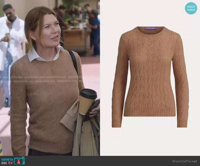 Meredith Grey (played by Ellen Pompeo) on Greys Anatomy on ABC was spotted wearing this beige cable knit sweater on Greys Anatomy on episode 'Between Two Lungs' (22x03) in Oct 2025. Meredith's Sweater is the Cable-Knit Cashmere Sweater in Lux Camel by Ralph Lauren Collection.