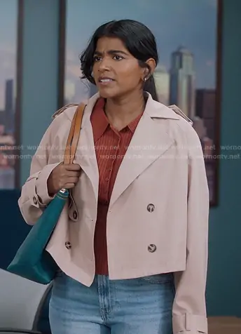 Kavita Mohanty (played by Anita Kalathara) on Greys Anatomy on ABC was spotted wearing this orange ribbed polo and pink jacket on Greys Anatomy on episode 'Between Two Lungs' (22x03) in Oct 2025. 's Top is the Rib Short Sleeve Polo Sweater in Russet by Mango . 's Jacket is the Enola Crop Trench Coat by Rue Sophie.