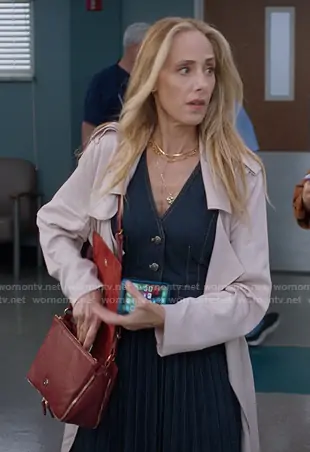 Teddy Altman (played by Kim Raver) on Greys Anatomy on ABC was spotted wearing this denim pleated dress on Greys Anatomy on episode 'Between Two Lungs' (22x03) in Oct 2025. Teddy's Dress is the Esther Dress in Indigo by Cinq a Sept . Teddy's Bag is the Igor Crossbody Bag by Jérôme Dreyfuss . Teddy's Shoes is the Eden Strap Leather Ballet Flats in Adobe Black by Stuart Weitzman.