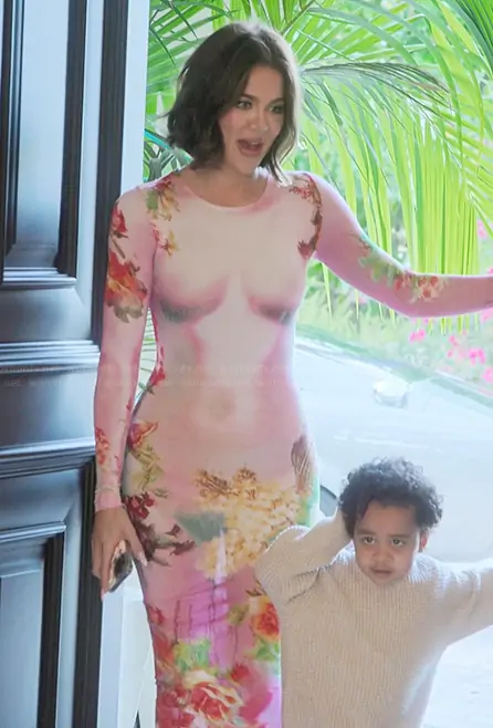 Khloe Kardashian (played by Khloe Kardashian) on The Kardashians on Hulu was spotted wearing this pink floral mesh dress on The Kardashians on episode 'Episode 1' (7x01) in Oct 2025. Khloe's Dress is the Printed Body Flowers Long Sleeve Dress by Jean Paul Caultier.