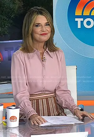 Savannah Guthrie on Today on NBC was spotted wearing this pink broderie trim blouse and striped skirt on Today on Oct 24 2025's episode. Savannah's Top is the In-The-Details Blouse in Smoke Pink by Me+Em . Savannah's Skrit is the Luminosity Lurex Stripe Skirt by Zimmermann.